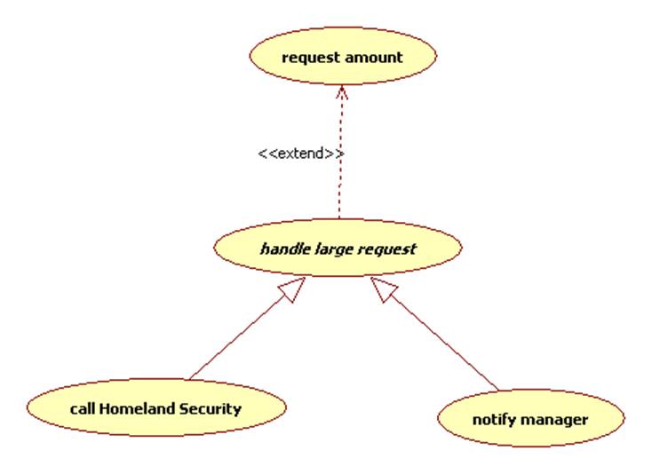 With this in mind, we can simplify use case diagrams by introducing the notion of an abstract use case. An abstract use case (shown with an italicized name) has no scenarios. All of the scenarios are instances of specializations.