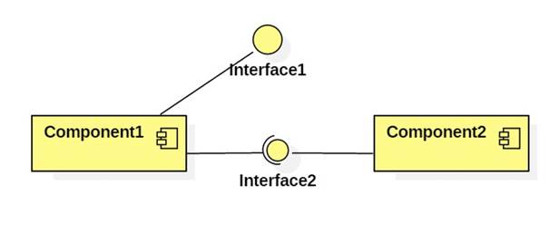 In the following diagram Component1 realizes (or implements) Interface1 and requires Interface2, which is realized by Component2.