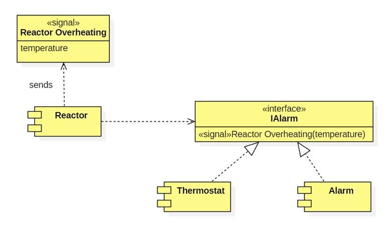 For example, a nuclear reactor broadcasts an "overheating" signal when it gets too hot. The signal contains the current temperature of the reactor as an attribute. Components that implement the IAlarm interface must provide a reception for this signal. In other words, they must handle these signals when they are received.