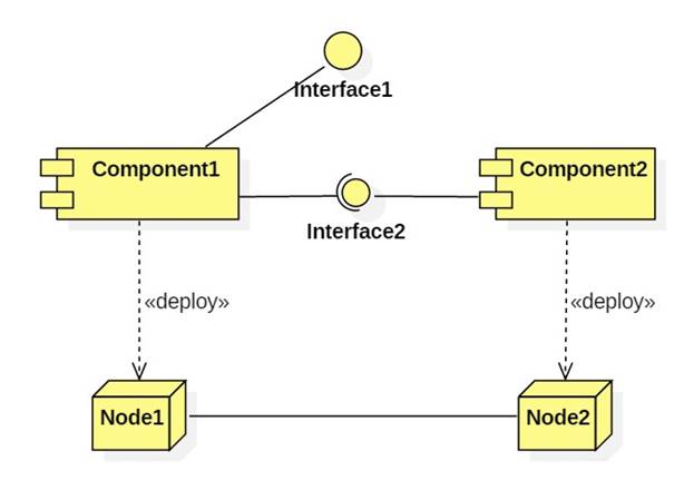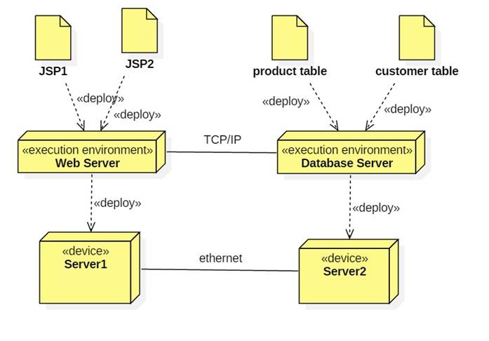 There are two types of nodes: devices and execution environments. Examples of devices include servers, client desktops, mobile devices, and embedded devices. Examples of execution environments include operating systems and component containers (.Net, J2EE container, Web Server).