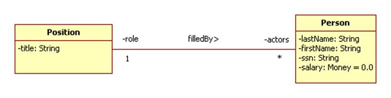 The relationship "Position X is filled by person Y" can be represented by an association connecting Position and Person: