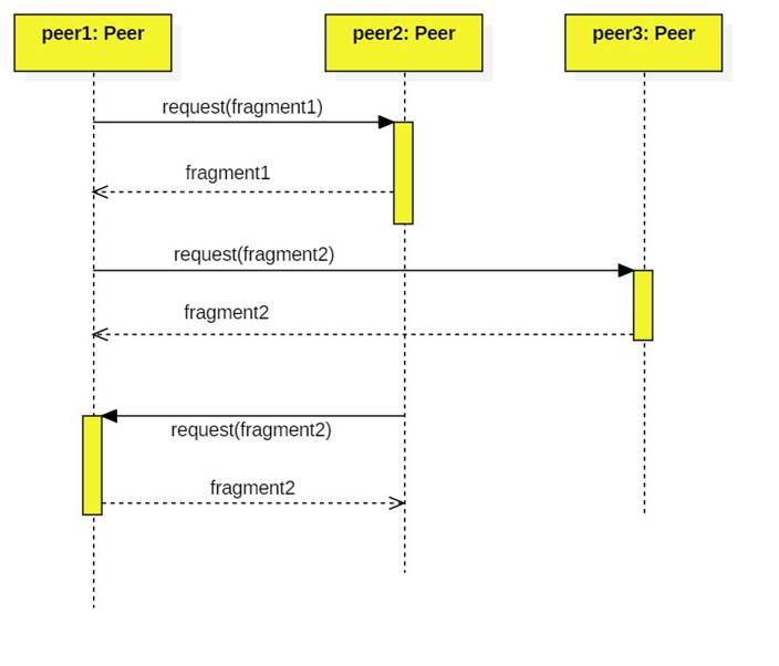 of a file. Peer1 wants to assemble the file, so requests fragments from peers 2