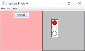 Stoplight Simulator allows a user to control a simulated stoplight by clicking the "Change" button or by selecting the "Change" item from the Edit menu.