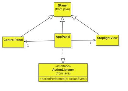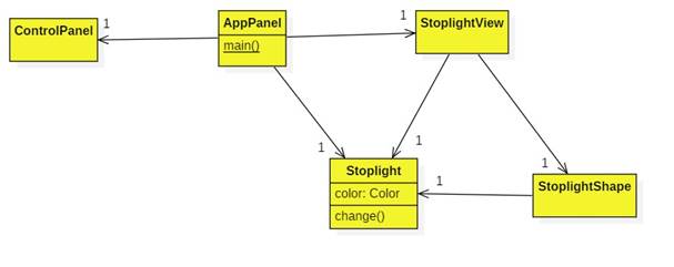 Stoplight Simulator instantiates the Model-View-Controller architecture. The Stoplight class plays the model role, the StoplightView class plays the role of view, and the AppPanel class plays the role of controller: