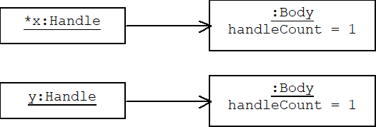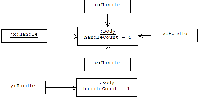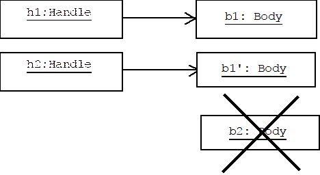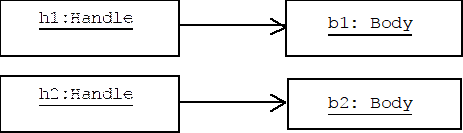 Sometimes the responsibilities of an object naturally divide into two categories. In these situations it is often a good idea to separate these responsibilities into two associated objects. In the Canonical Form Pattern (see below), for example, the handle performs memory management duties while the body implements application logic. In the Model-View-Controller Pattern (see Chapter 6) a view object (the handle) is responsible for displaying application data, while a model object (the body) stores and manipulates application data.