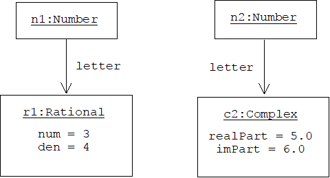Implementation of Number constructors must be separated from their declaration, because at the time of declaration, we didn't know what type of derived class constructors would be available to us. For example, the Number constructor receiving two ints, n and d, must define letter = new Rational(n, d).