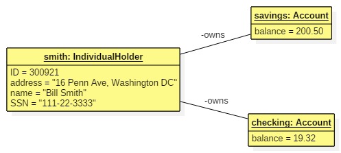 · The "owns" association represents the relationship "Account holder X owns account Y" or equivalently: "Account Y is owned by account holder X".