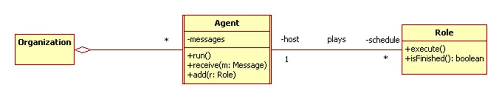 An agent has a schedule (list) of roles that it plays. New roles can be added to the schedule. The agent perpetually cycles through its schedule, executing each role. (Note that agents are active objects.)