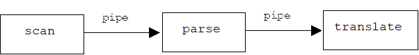 The scanner reads a stream of characters from a source code file and produces a stream of tokens. A parser reads a stream of tokens and produces a stream of parse trees. A translator reads a stream of parse trees and produces a stream of assembly language instructions. We can insert new filters into the pipeline such as optimizers and type checkers, or we can replace existing filters with improved versions.