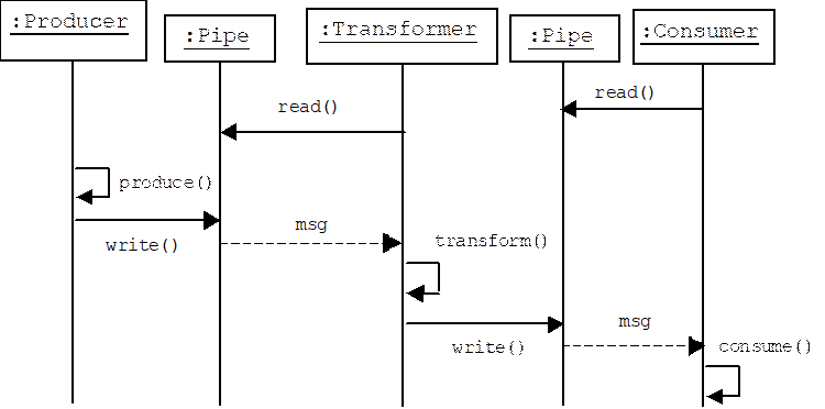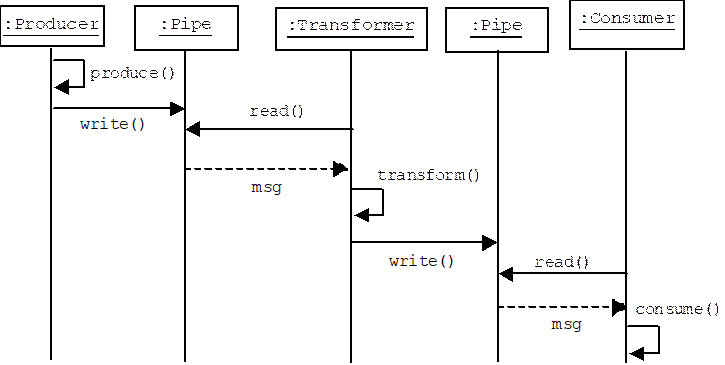 Both diagrams reveal a design problem. How does the transformer know when to call pipe1.read()? How does the data-driven consumer know when to call pipe2.read()? How does the demand-driven producer know when to produce a message? Active filters solve this problem by polling their input pipes or blocking when they read from an empty input pipe, but this is only feasible if each filter is running in its own thread or process.