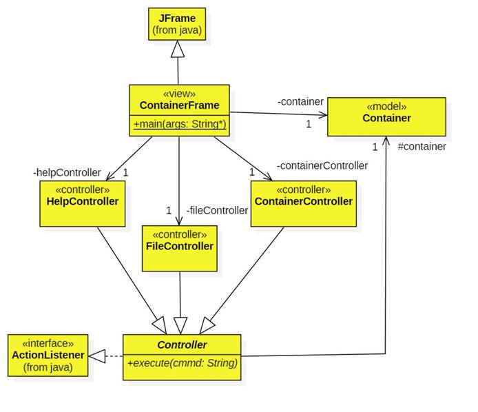 · Each menu (File, Help, and Container) has its own controller. The container controller also controls the buttons.