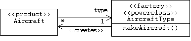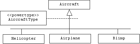 Alternatively, we could define a single Aircraft class and represent the different types of aircraft by different instances of an AircraftType power type. In this case it's common for instances of the power type to act as a factories that create instances of the type of objects they represent, the same way a class would provide a constructor for creating instances. It is also common for products created by a power type object to carry a type pointer back to the factory that created them:
