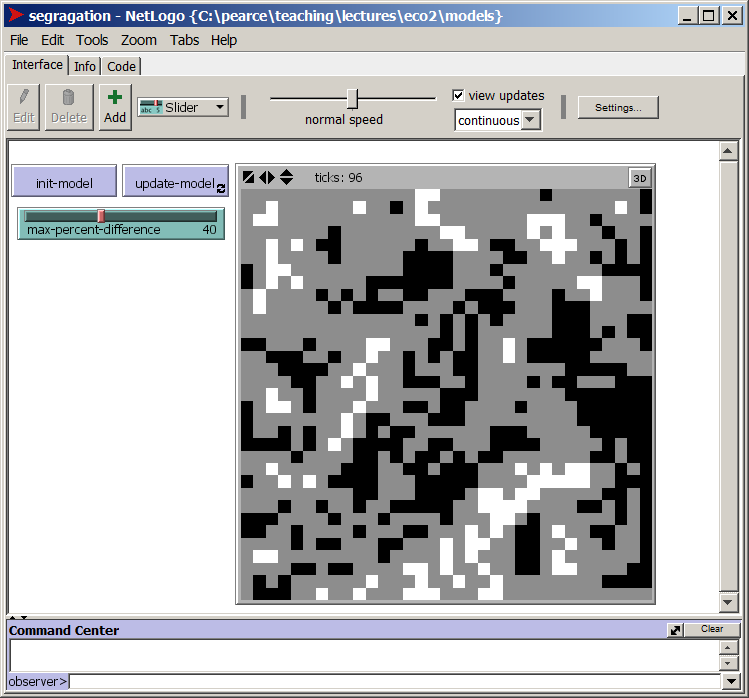 Here's a screen shot of the segregation model's interface after 96 ticks starting from a random distribution of states. Notice that stable segregated neighborhoods have already formed despite the fact that the slider control indicates that as much as a 40% difference in race would be tolerated by inhabitants: