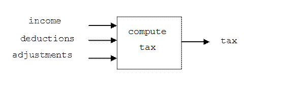In reality, a system function gathers its inputs from a dialog with the user. The nature of this dialog must be carefully specified. Also, the output might be multi-faceted, including updates to the system data and updates of all open views of the system data. (Think of the difference between the compute-tax function above and TurboTax!) For this reason functional requirements are often expressed in the form of use cases.