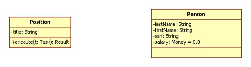 In the hr package we might find the Position and Person classes. Typical attributes of persons and positions can be listed in the attribute compartments of the respective class icons. Typical operations performed by persons and positions can be listed in their operation compartments: