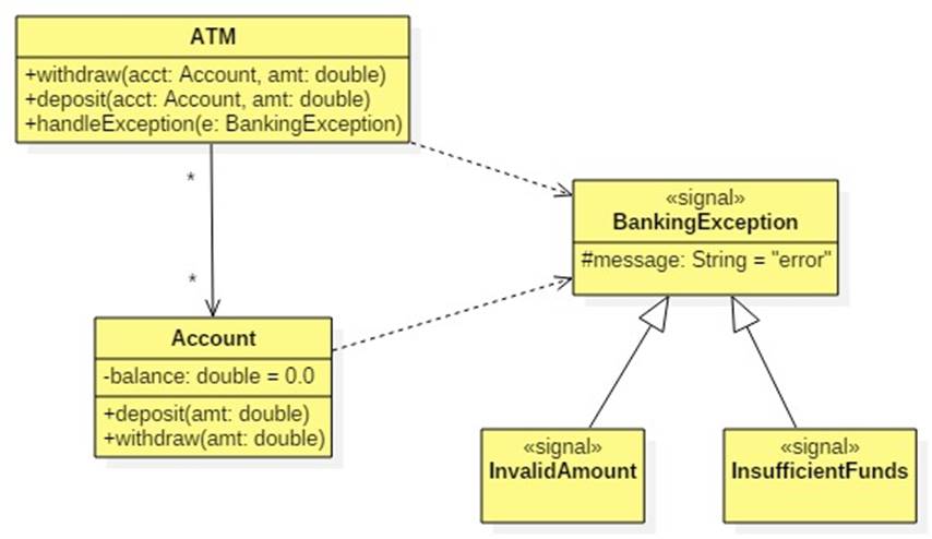 Note that exception classes are modeled as signal classes (i.e. classes with the <<signal>> stereotype). Although not visible in the diagram, the model specifies that the Account.deposit method raises (throws) InvalidAmount exceptions and the Account.withdraw method raises (throws) InvalidAmount and InsufficientFunds exceptions. These exceptions are caught and handled in the ATM class. Dependency arrows indicate that changes to the exception hierarchy may require changes in the Account and ATM classes.
