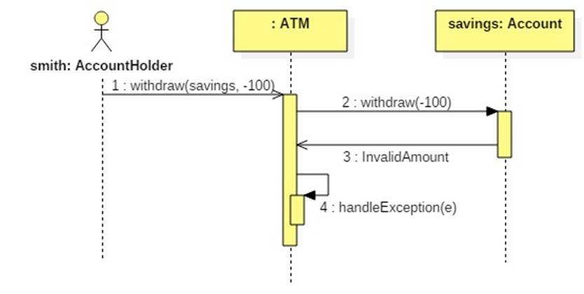 Message 3 is an asynchronous, internal signal event, savings.withdraw(-100) is throwing an InvalidAmount exception.
