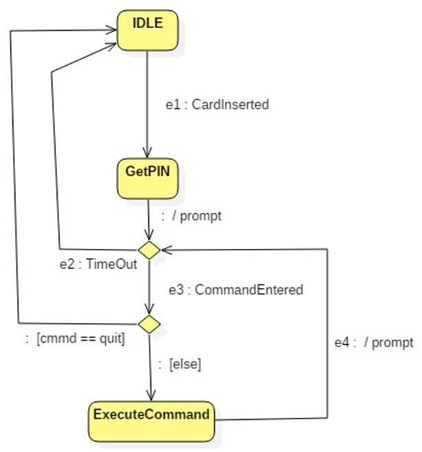 Rectangles represent internal states of the ATM. Arrows represent transitions between states.