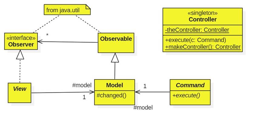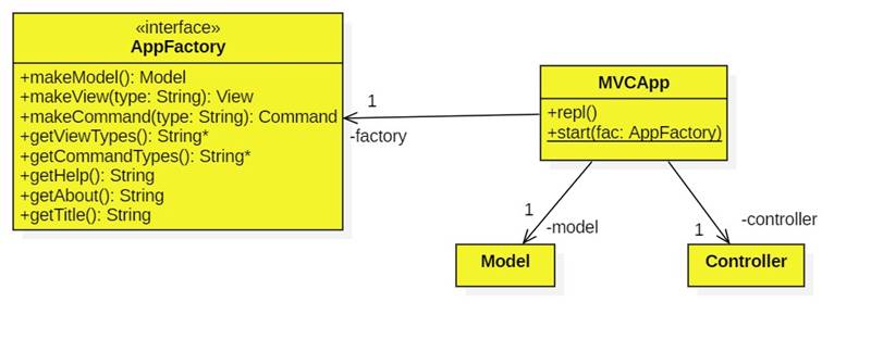 · MVCApp is the heart of the application. Its static start method uses a factory to create a model, a controller, and a default view, then calls repl.