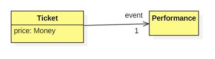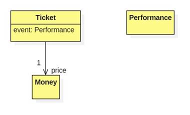 Assume we want to build a model for an online ticket vendor. In this model a ticket has two properties: a price of type Money and an event of type Performance.