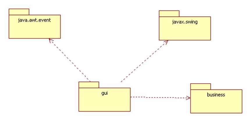 Note that the gui package depends on the business package as well as two packages imported from the Java class library.