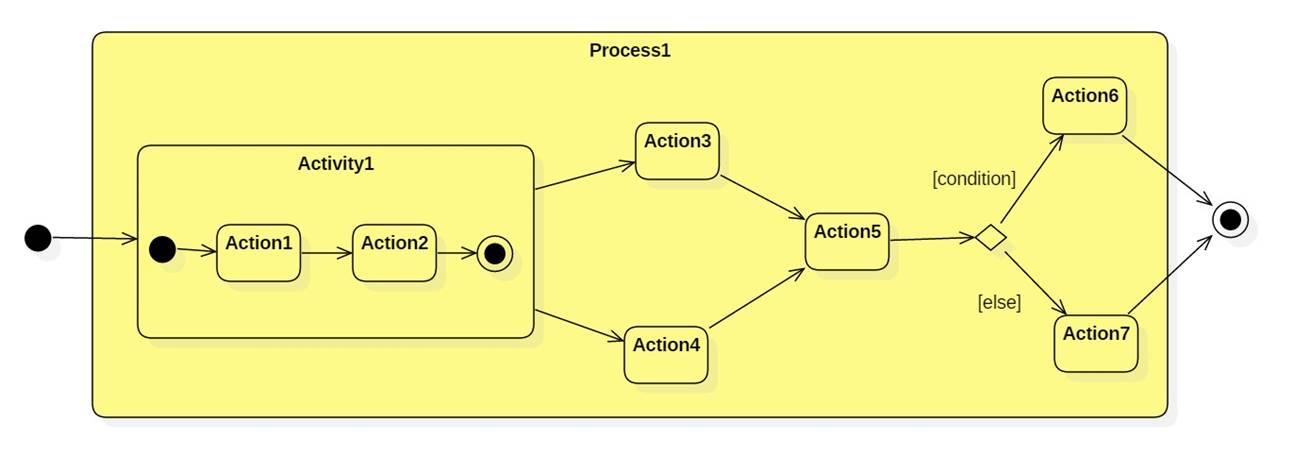 Process1 is an activity. It begins with Activity1. This activity is a sequence of two simple actions. Activity1 completes when Action2 completes. Action3 and Action4 cannot begin until Activity1 completes. Action5 can't begin until Action3 and Action4 complete. (In UML we would use synchronization bars to show this.) A branch is a special type of activity with an associated condition and two predecessors. If the condition is true, then the first predecessors is executed, otherwise the second predecessor is executed.