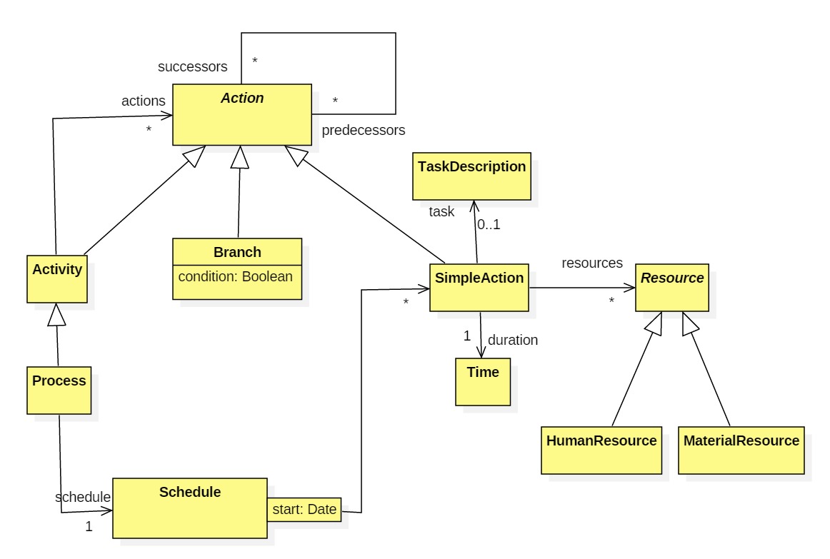 The model presented below diverges from UML activity diagrams. It uses the Composite Design Pattern to differentiate between simple actions and composite actions (called activities). A process is an activity with an associated schedule. A schedule maps start dates to simple actions. Simple actions have assigned resources and durations.