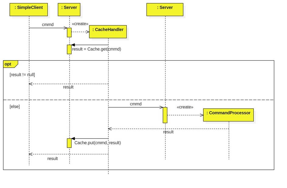 Upon receiving a command from a client, the cache proxy creates a cache handler. The handler searches a cache to determine if the command has been seen before and if so, what the result was. If not, the handler forwards the command to the server, which replies with the result. The cache handler updates the cache and returns the result to its client.