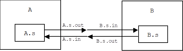 · A socket s has an output stream (s.out) and an input stream (s.in). In the example below scs.out is connected to rhs.in, and vice-versa. (See below for more details about sockets.)