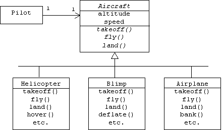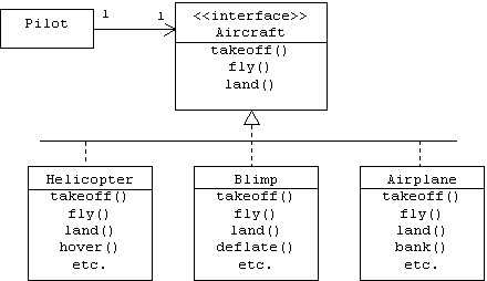 Notice that all three realizations of the Aircraft interface support additional operations: airplanes can bank, helicopters can hover, and blimps can deflate. However, the pilot doesn't get to call these functions. The pilot only knows about the operations that are specifically declared in the Aircraft interface.