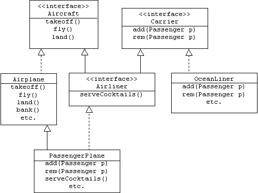 We can create new interfaces from existing interfaces using generalization. For example, the Airliner interface specializes the Aircraft and (Passenger) Carrier interfaces. The PassengerPlane class implements the Airliner interface, which means that it must implement the operations specified in the Aircraft and Carrier interfaces as well. Fortunately, it inherits implementations of the Aircraft interface from its Airplane super-class: