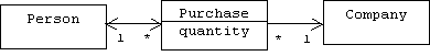 Now consider the relationship "Person P purchases N shares of Company C." Again we might represent this relationship as a simple association between the Person class and the Company class. Again we are confronted with the problem of where to store the quantity attribute, N. Clearly, purchases should be represented as instances of a Purchase class with a quantity attribute. In fact, the implementation of the Purchase class would be almost identical to the implementation of the Owns class shown above.