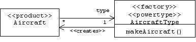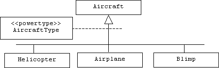 Alternatively, we could define a single Aircraft class and represent the different types of aircraft by different instances of an AircraftType power type. In this case it's common for instances of the power type to act as a factories that create instances of the type of objects they represent, the same way a class would provide a constructor for creating instances. It is also common for products created by a power type object to carry a type pointer back to the factory that created them: