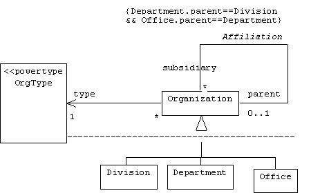 The problem with this model is that both the rules and types of organizations change from time to time and from enterprise to enterprise. It's also not clear how programmers should enforce the constraint attached to the affiliation association.