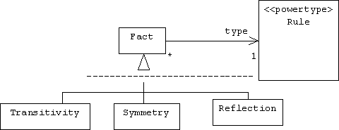 We can think of the above fact as an instance of the above rule. This suggests that we can think of a rule as the type of a fact. This further suggests that we can explicitly represent rules as classes, and facts as objects: