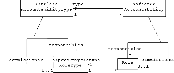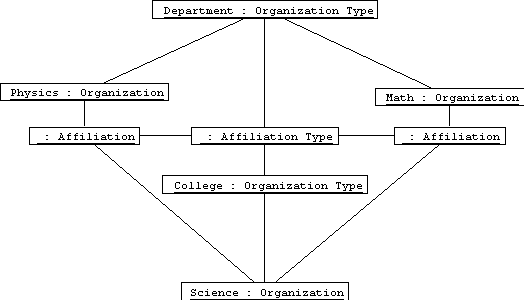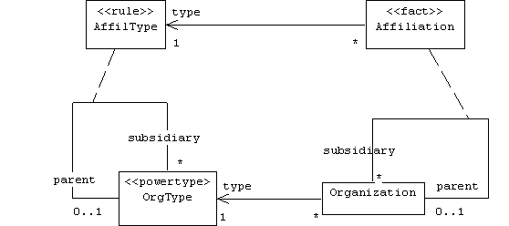 If we take this approach in our organizational model, then we notice that affiliation facts are simply the instances of the affiliation association. Since a fact must store its rule/type, we'll need to represent links between parent and subsidiary organizations as link objects, instances of an association class named Affiliation. An interesting observation is that in this case instances of our rule class-- AffilType-- are link objects that link OrgType instances, making AffilType an association class, too: