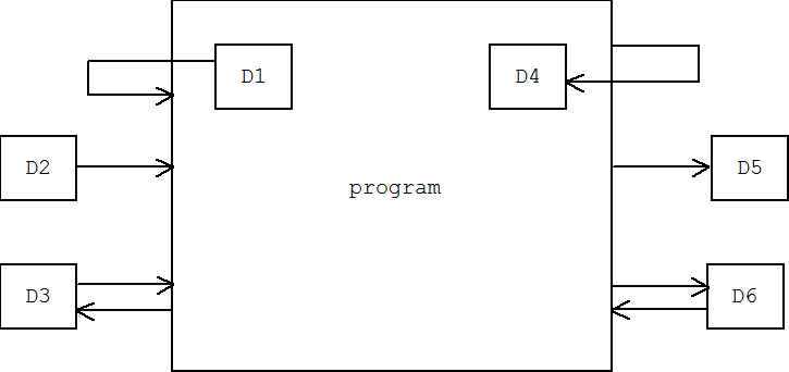 In the following diagram a program has streams connecting it to six "devices". The program plays the role of sink for D1 and D2, the role of source for D4 and D5, and is both a source and a sink for D3 and D6. The devices might be keyboards, modems, other programs, files, or arrays (or strings) inside of the program itself (this is the case with D1 and D4).
