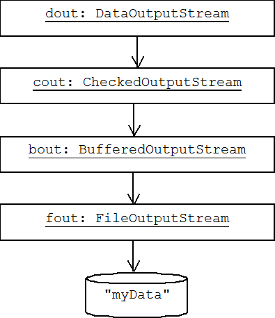 For example, the following Java code creates a sequence of three filters in front of a file output stream: