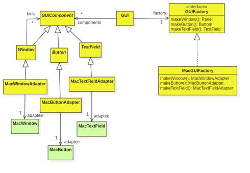 Using this idea we could define abstract GUI component classes for windows, buttons, text fields, etc. We provide the GUI constructor with an abstract factory for making these components. On a Mac we create adapters that adapt the corresponding Mac GUI components to our abstract components and a concrete factor that makes these components.