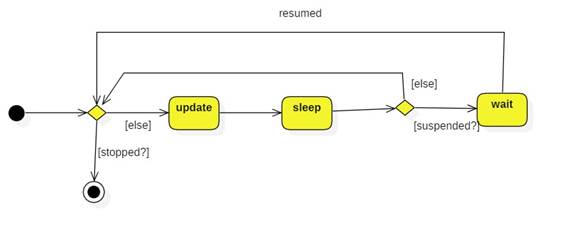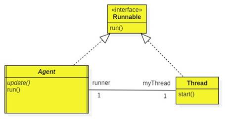Each agent owns a thread that executes the agent's run method. Until it is stopped, the run method repeatedly calls the abstract update method, sleeps for one second (this releases the processor and gives other agents a chance to run), then waits to be resumed if it has been suspended: