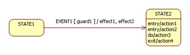 Semantically this diagram says that if the current state of statechart machine M is STATE1, then when EVENT1 occurs, and if guard1 is true, then actions effect1 and effect2 will be performed and the current state will become STATE2. Upon entering STATE2, M will perform action1 and action2. While the current state is STATE2, M continually performs action3. Upon exiting STATE2, action4 will be performed.