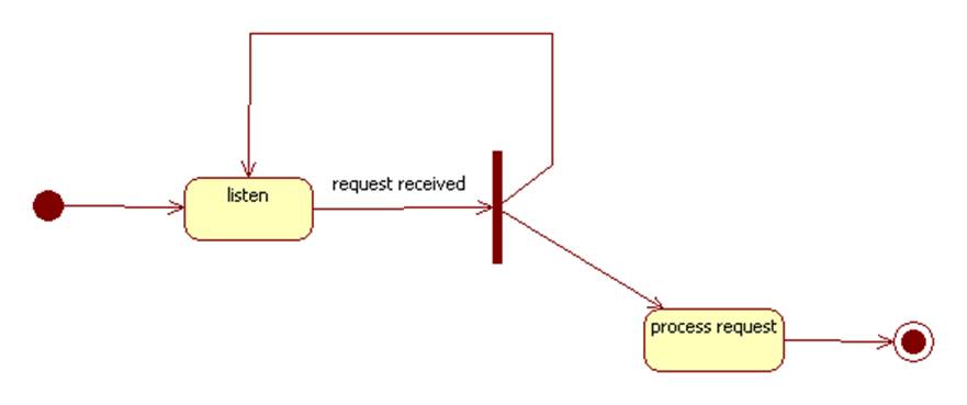 A transition without a trigger, like the one above, usually emanates from a state representing some kind of action. Completion of the action triggers the transition.