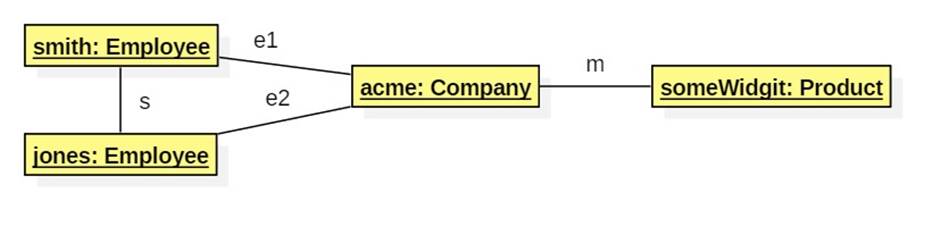 For example, assume Smith supervises Jones. Both work for a company called Acme which manufactured some widget. We could represent this using an object diagram consisting of four objects and four links. Link s is an instance of the supervises association, e1 and e2 are instances of the employed-by association, and m is an instance of the manufactures association: