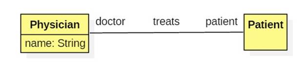 The treats association has two endpoints named doctor and patient. These names are how instances of one class refer to instances of the other. They are often translated into fields by code generators: