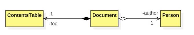 A document has an author and a table of contents. It shares the author with other documents. Destroying the document does not destroy the author. The table of contents is not shared by other documents. Destroying the document does destroy the table of contents.