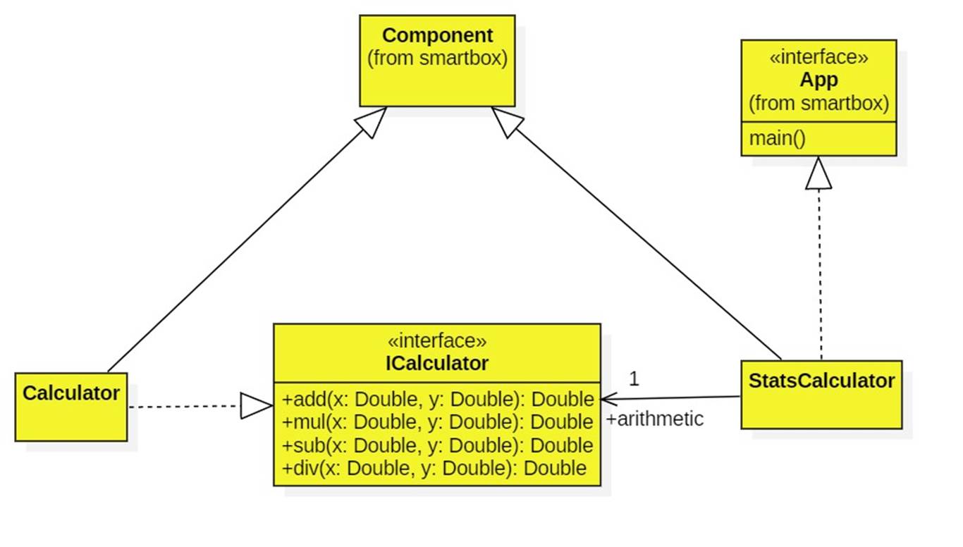 In this example there are two components: A simple calculator component that implements the ICalculator interface, and a statistics calculator that depends on the ICalculator interface. This is how the above application would be expresses as a UML component diagram: