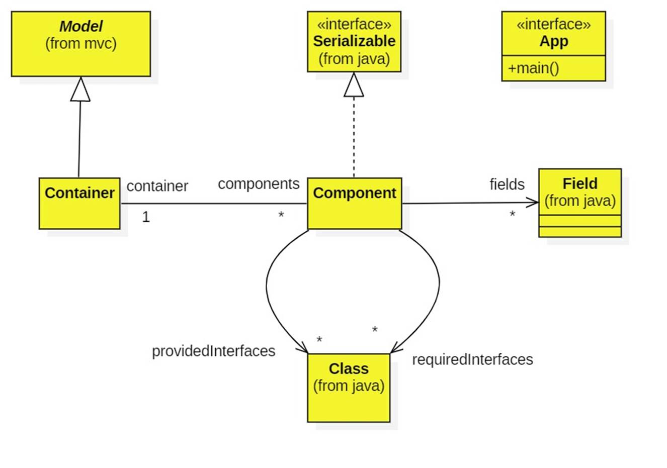 A container contains components. Each component maintains a set of provided and a set of required interfaces as well as a collection of fields.
