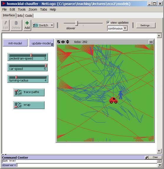 Let's build a computer simulation to find out. In this simulation a blue turtle represents the pedestrian and a red turtle represents the car. Sliders allow us to adjust the speeds of the car and pedestrian as well as the turning radius of the car. A switch allows users to turn on and off the path tracing feature. If and when the car hits the pedestrian, we hear a beep and the simulation ends.