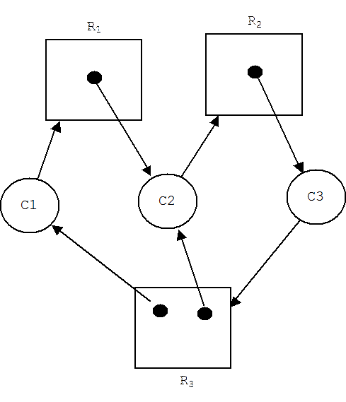 Deadlock occurs when, for example, agent C1 holds resource r3 and waits for resource r1, agent C2 holds resource r1 and waits for resource r2, and agent C3 holds resource r2 and waits for r3. (More or less the picture above).