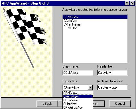 iii. The [Step 6 of 6] dialog displays the classes and files that will be generated by the App Wizard. It also displays the base class of each class. Select the CCalcView class. Notice that its base class is CView. Use the drop down list to change this to CFormView, then click [Finish].